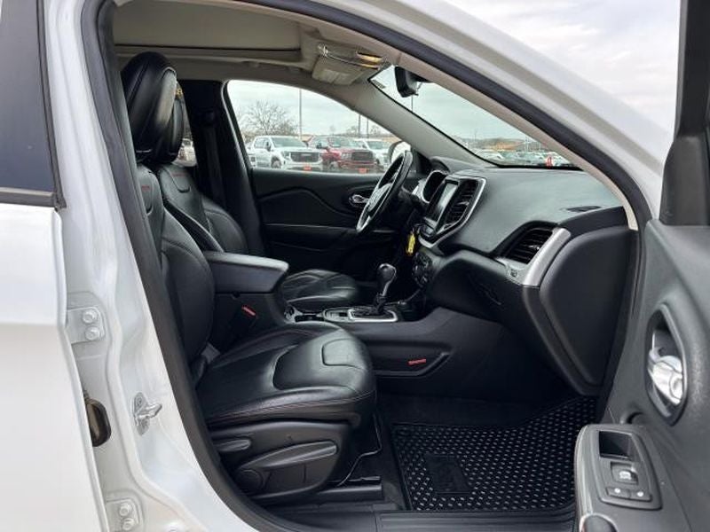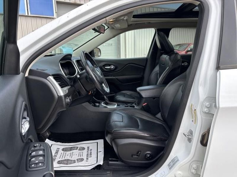 This unit features a hands-free Bluetooth® phone system. See what's behind you with the back up camera on this model. The leather seats in the Jeep Cherokee are a must for buyers looking for comfort, durability, and style. The vehicle has a clean AutoCheck report. It embodies class and sophistication with its refined white exterior. This model has four wheel drive capabilities. This Jeep Cherokee has a V6, 3.2L high output engine. The high efficiency automatic transmission shifts smoothly and allows you to relax while driving. The fog lights cut through the weather so you can see what's ahead. The Jeep Cherokee is equipped with a gasoline engine. Electronic Stability Control is one of many advanced safety features on this model. Easily set your speed in this mid-size suv with a state of the art cruise control system. Increase or decrease velocity with the touch of a button. This mid-sized SUV is perfect for your next adventure.